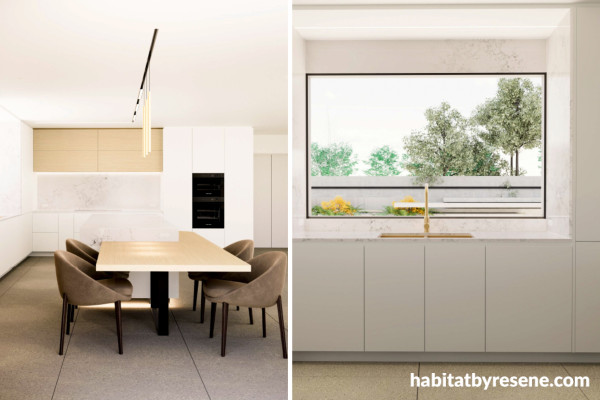 Na followed a specific client brief and site plan provided by NKBA to design her kitchen concept, and the result is striking and minimal with clean lines and practical use of space. She chose Resene Half Sea Fog for the kitchen walls, cabinetry and ceiling, creating a bright space that pairs well the light timber, gold fixtures and stone benchtop and floor.