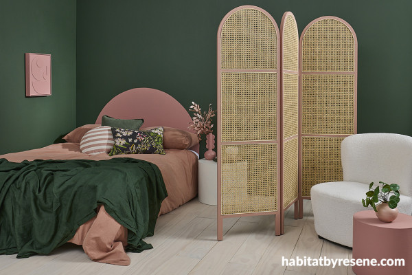 Darker, forest toned greens work well with dusky reds and warm pinks. In this space, the wall is painted in Resene Forest Green and arch headboard and reading area side table in Resene Coral Tree. The edge of the Mocka rattan screen is painted in Resene Summer Rose, flooring is stain colour washed in Resene Colorwood Breathe Easy, bedside table in Resene Meringue and DIY artwork, vases and other accessories in Resene Coral Tree and Resene Meringue. Bedlinen from Adairs, throw from H&M Home, cushions from Mocka, Adairs and H&M Home. Project by Vanessa Nouwens, image by Bryce Carleton.