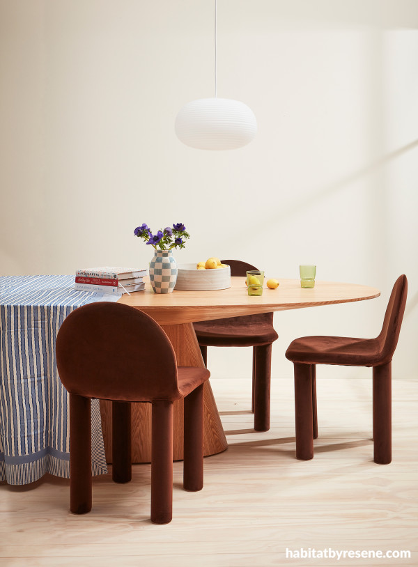 Designers are increasingly embracing the rich, earthy pairing of cream and chocolate brown as a softer and more inviting alternative to a classic black and white palette. This shift brings a sense of warmth and tactility, grounding spaces in natural tones that feel both contemporary and comforting. These walls are painted in Resene Meringue and floor finished in Resene Colorwood Breathe Easy and overcoated with Resene Qristal ClearFloor. Table from Soren Liv, chairs from Slow Store, pendant lamp from Lighting Direct, bowl, glassware, tablecloth and books from A&C Homestore, vase from Kmart.