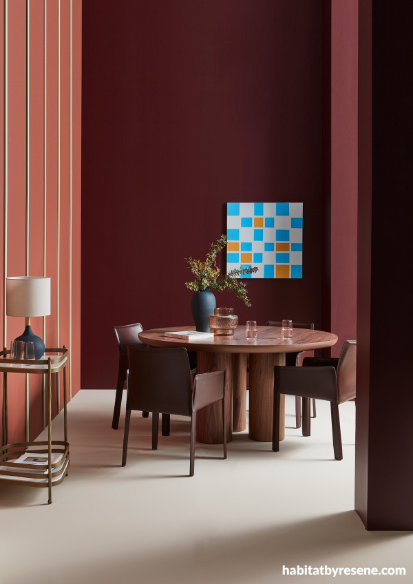 Deep, dramatic red paint colours continue to be prized for infusing intimate interior spaces with a sense of passion, confidence and historical richness. Whether used to envelop a room or as a striking accent, these saturated hues create an atmosphere that is both moody and magnetic. In this space, the back wall and columns are painted in Resene Spitfire, left wall in Resene Half Hairy Heath with moulding in Resene Earthstone, floor in Resene Sugar Loaf, vase and lamp base in Resene Dark Knight and artwork in Resene Breeze, Resene Malibu and Resene Pizza. Table, chairs and trolley from Soren Liv.
