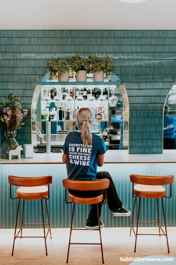 Once home to the 1950s Tui Tearooms, the building was restored to honour its local history while giving it a bold, modern look. Drawing inspiration from Whitestone’s flagship Windsor Blue cheese and the Oamaru coastline, Annabel chose a vibrant Resene colour palette featuring the cool blue of Resene Lynchpin and the coral-toned Resene Awaken. “The Resene palette informed every selection of materials and finishes,” she explains. “If I couldn’t find what I needed, I had it made to match.”