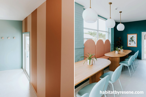 Colour surprises and delights throughout Whitestone with a striped wall in Resene Cashmere and Resene Kalgoorie Sands, main walls in Resene Sorrento and Resene Casal, a ceiling in Resene Double Alabaster, and all of the playful and inviting décor to match.