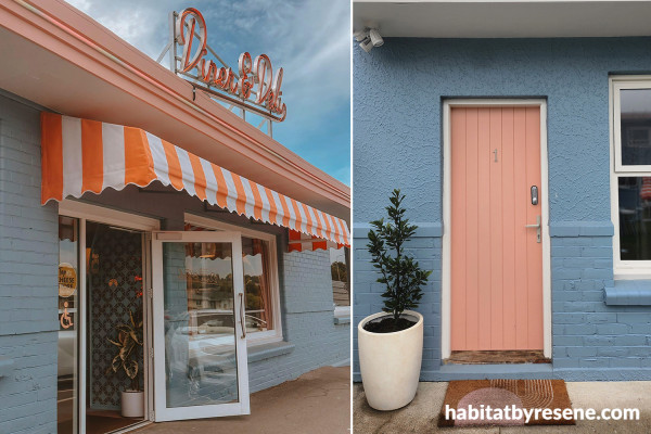 Inside, layers of soft and rich hues using Resene SpaceCote Low Sheen and Resene Lustacryl in Resene Quarter Kalgoorie Sands, Resene Sorrento and Resene Casal, alongside custom joinery and retro details reflect both the diner’s history and Whitestone’s personality.