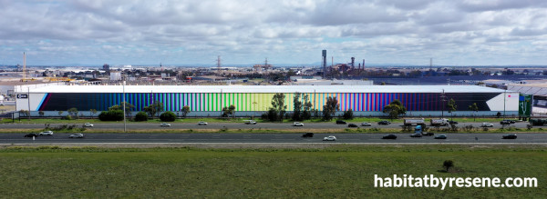 Mural artist DREZ, @d.r.e.z, transformed the side of the ESR warehouse at Laverton in Victoria, with ‘Chromatic Oscillation’, a 2000m2-plus mural in his distinctive style. Image courtesy of Studio DREZ .