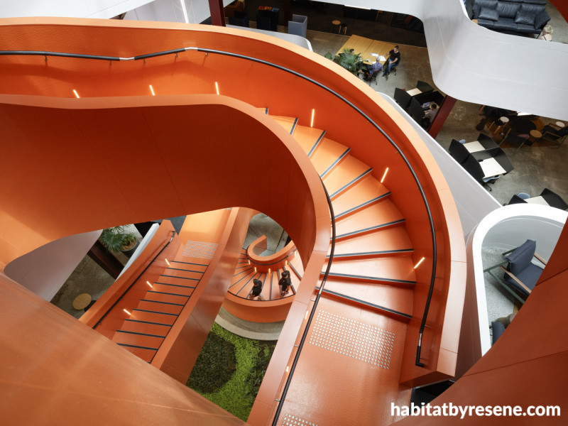 A striking custom Resene orange was used to colour the organic, winding staircases that characterise the centre of Auckland’s B:Hive mixed-use office building.