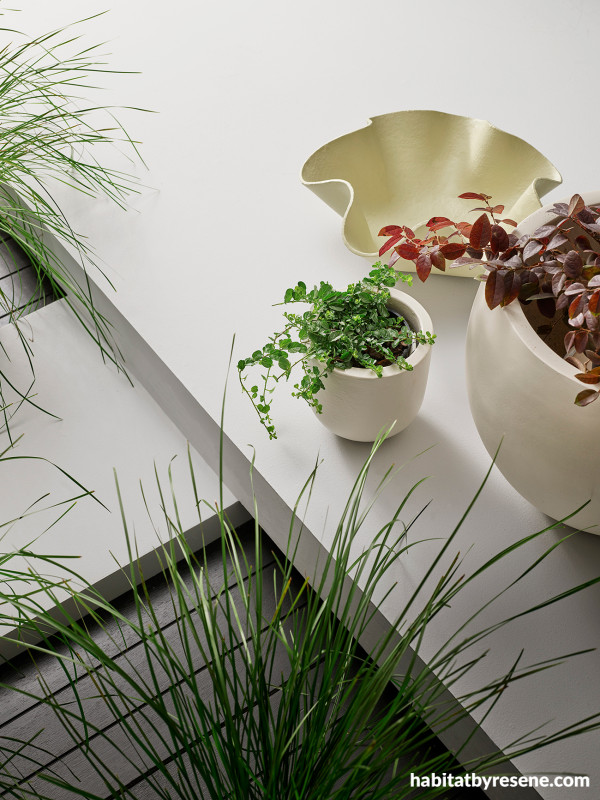 Concrete patio painted in Resene Walk-on tinted to Resene Ted (which is named after Resene’s founder!) timber decking in Resene Woodsman Decking Stain CoolColour Pitch Black, wavy planter and small pot in Resene Lumbersider Low Sheen tinted to Resene Earthstone and large planter in Resene Lumbersider Low Sheen tinted to Resene Half Tea. Projects by Amber Armitage, images by Melanie Jenkins and Wendy Fenwick.