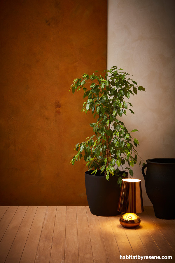 Feature wall in Resene FX Faux Rust Effect, walls painted in Resene Half Sisal with Resene FX Paint Effects mixed with Resene Half Blanc applied on top, black plant pots painted in Resene Charcoal and rust-look plant pot in Resene FX Faux Rust Effect. Use Resene Woodsman Decking Oil Stain in Natural for a grounded finish.