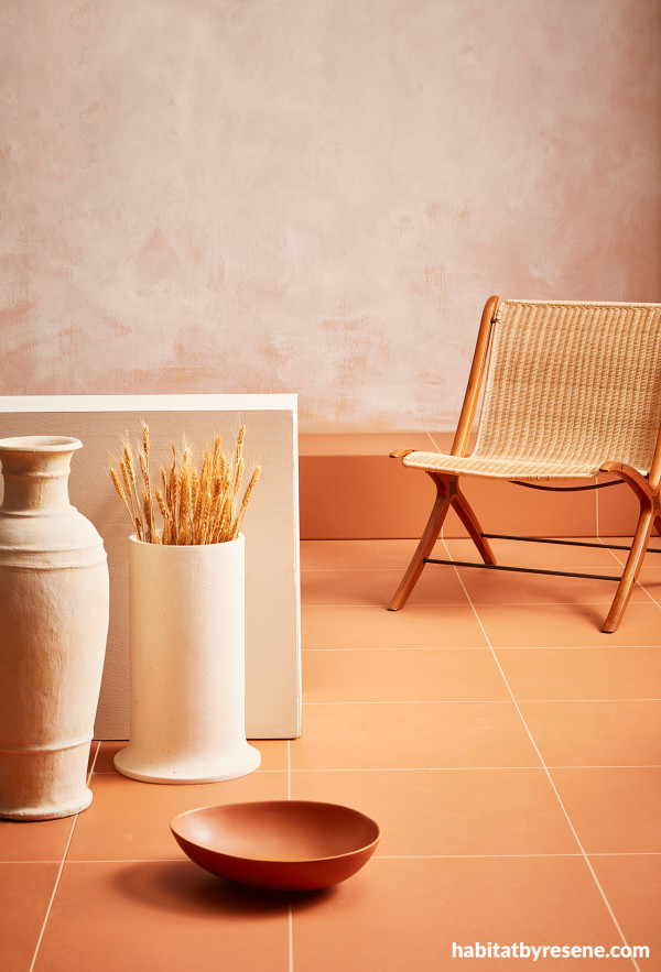 Wall painted in Resene Alamo with Resene FX Paint Effects Medium mixed with Resene Half Sour Dough applied on top, terracotta floor effect in Resene Walk-on in Resene Pendragon with ‘grout’ lines in Resene Half Sour Dough, left vase painted in Resene Alamo with Resene FX Paint Effects Medium mixed with Resene Half Scotch Mist applied on top. Chair from Good Form, bowl and right vase from Città.