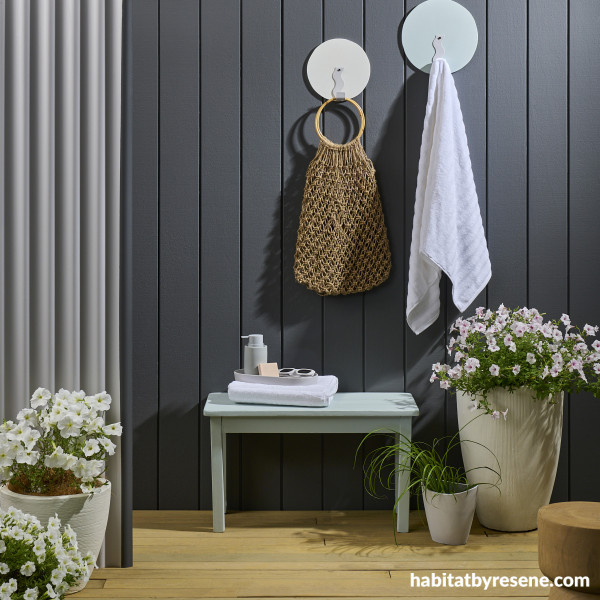 V groove walls painted in Resene Half Baltic Sea, stool stain colour washed in Resene Bask, decking stained in Resene Uluru, shower screen in Resene Pale Slate, bench seat in Resene Nebula, pots in Resene Villa White, round circles in Resene Nebula and Resene Villa White, squiggle hooks in Resene Pale Slate and wooden towel crate in Resene Villa White.