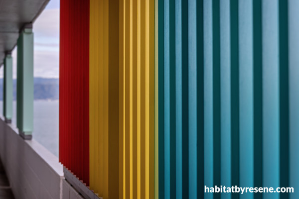 The previously neutral exterior windshields at Gateway Apartments were repainted in Resene Sonyx 101 semi-gloss in a variety of vibrant hues. Project by DLA Architects. Build by LT McGuinness. Painting by All Painting Service. Images by Paul McCredie.