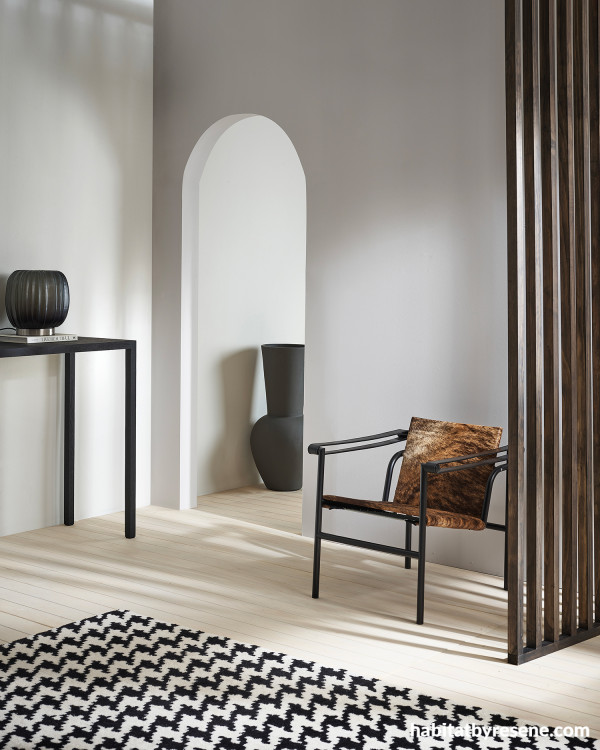 Monochrome magic: arched wall painted in Resene Kinship, left wall and back wall in Resene Sea Fog and floor finished in Resene Colorwood Breathe Easy. Timber partition in Resene Colorwood Tiri. Floor vase in Resene Boris. Console and armchair from Matisse, lamp from ECC and rug from Ligne Roset. Stylist: Amber Armitage. Photographer: Wendy Fenwick.
