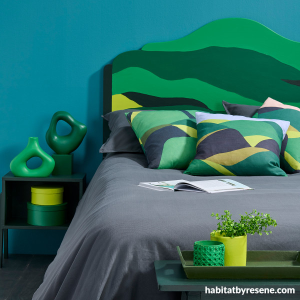 In this bedroom, the zingy yellow-green of Resene Citrus on the plant pot, headboard and round box offes the perfect accent against the wall in Resene Ming and accessories and headboard in Resene Midnight Moss, Resene Kaitoke Green, Resene Crusoe and Resene Kaitoke Green. Resene Living duvet from Briscoes, cushion covers by Alice Berry from A Bolt of Cloth. Project by Megan Harrison-Turner, image by Bryce Carleton.