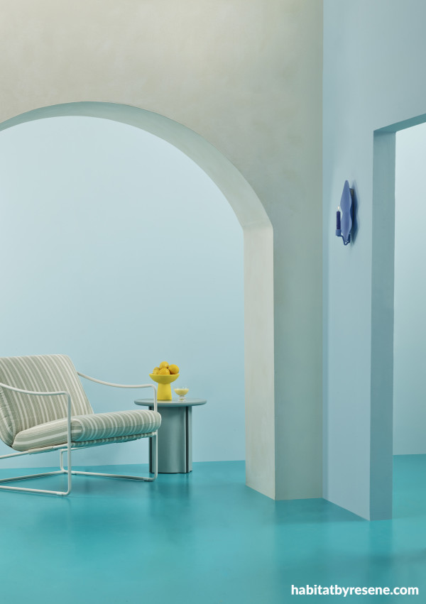 For a more nuanced translation, favouring a calm and soothing yet still characterful interpretation, we find joy in the glacial hues of our winter landscapes. Walls in Resene Alabaster (arched) and Half Sail, floor in Resene Java, wall sconce in Delta Blue and bowl in Broom. Side table and chair from Soren Liv.