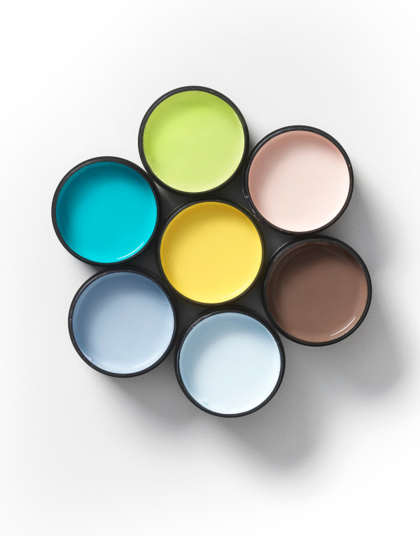 The colours of joy, clockwise from top: Resene Sublime, Sakura, Felix, Half Sail, Delta Blue and Java, with Broom in the centre.