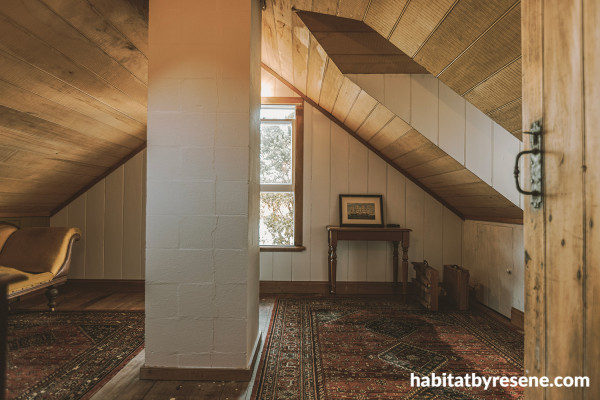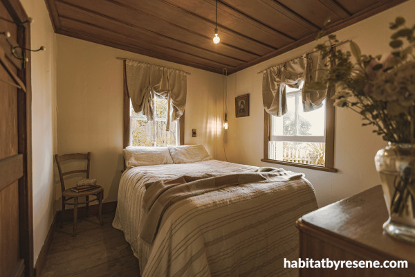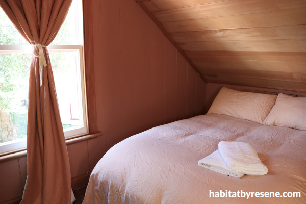 The upstairs bedroom is painted in the pink-toned terracotta hue of Resene Sante Fe, with matching linen and curtains that pair beautifully with the warmth of the timber ceiling. The window trims are painted in Resene Milk White.
