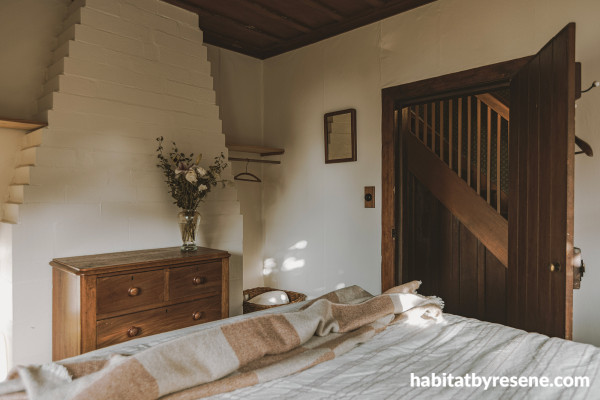 What was once a fireplace is now a charming feature in the downstairs bedroom. The bricks and walls are painted in Resene Milk White, adding brightness to the space.