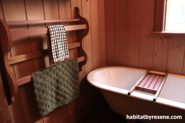 Hiding throughout The Dreamer’s Night Inn, you’ll find Resene Sante Fe painted on fittings and furniture like this towel rail and bath tray.