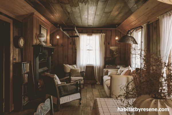 The cosy, cocooning living area is enveloped with natural materials, soft fabrics and flowing drapes, inviting you to settle in by the fire. The fireplace surround is painted in Resene Black. Use Resene Colorwood Teak for a dark timber stain like on this ceiling.