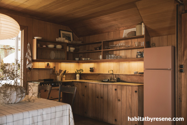 The earthy pink of Resene Sante Fe was used on the custom-colour Belling fridge and oven. For a warm wood look like this, use Resene Colorwood Natural on exposed timber.