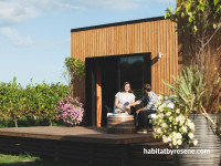 Since Noir and Blanc in 2022, two new cabins have since been designed in 2023, called Blanc and Harvest. The Blanc cabin offers a simple, crisp white palette, drawing inspiration from the white wine varieties offered at Matawhero. This luxury cabin is designed to draw in the natural elements surrounding its small but comfortable space, and is painted in Resene Triple Alabaster with the ceiling in Resene Alabaster. The elegant tongue-and-groove headboard is painted in Resene Breathless, a cool blend of blue, lilac and grey with an inspirational and airy ambiance. The baseboards to the exterior decking are stained in Resene Woodsman tinted to the striking shade of Resene Tiri.