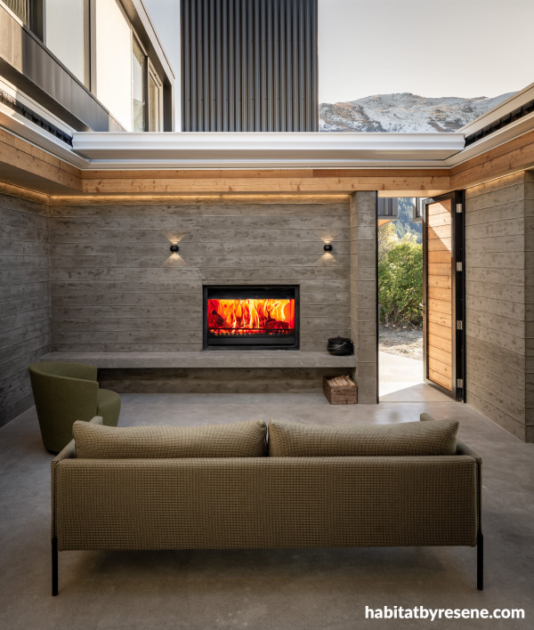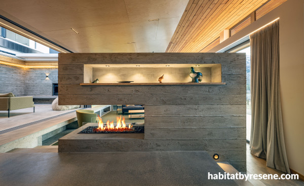 The impressive fire surround echoes the off-form concrete look of the internal courtyard and serves to demarcate the living area from the kitchen-dining area and internal viewing deck.