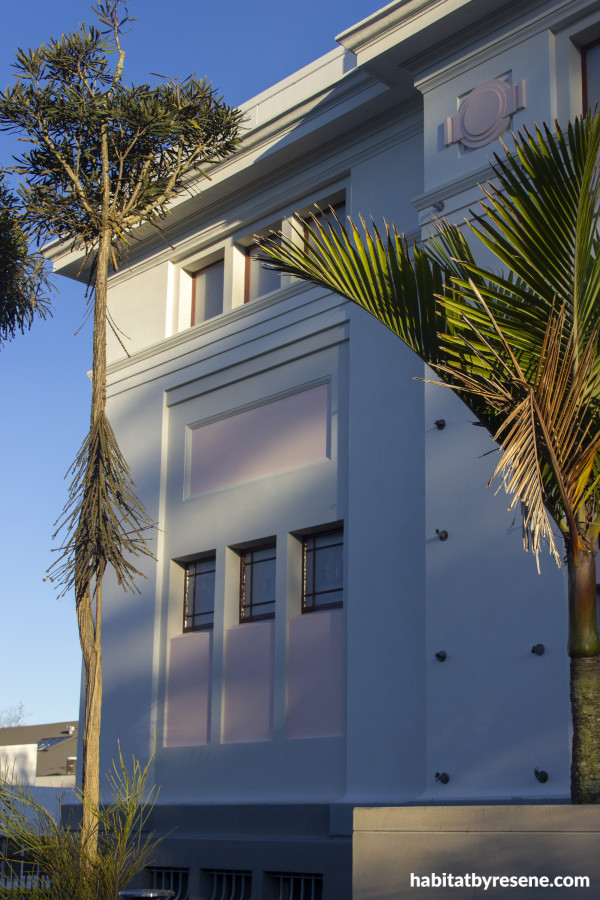 Panels of subtle Resene Soft Pink add warmth to the exterior in Resene Merino, Resene Triple Merino and Resene Scoria on window trims. The base of the building is painted in Resene Stack to ground the structure.