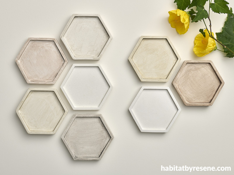 Concrete candleholders in Resene Concrete Clear satin tinted to Resene Stonewash (left) and Greigewash (right), concrete hexagon dishes in (clockwise from top left) Resene Concrete Clear tinted to Resene Whitewash, Resene Blondewash and Resene Claywash and vase painted in Resene Eighth Thorndon Cream. Concrete objects from Blow My Wick and taper candles from Tessuti.