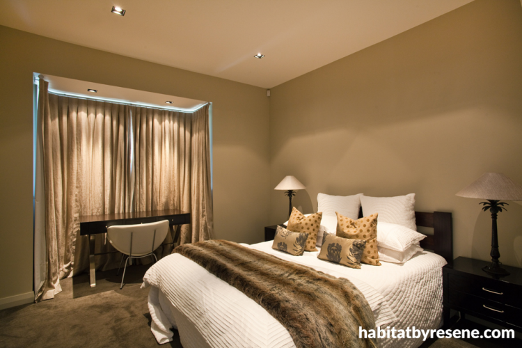 The master bedroom, painted in Resene Double Fossil, has a large walk-through dressing area.