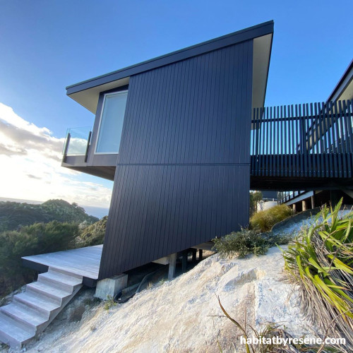 This home in Mangawhai Heads by Maurice Langdon of Eclipse Architecture (www.eclipsearchitecture.co.nz) has nearly 360-degree views of the coast and land, but the windswept site faces a constant battering from the elements. Luckily, its exterior finish is up to the task. Rodney Decorators and Painters recently repainted the house in Resene Ebony Clay, and it looks as good as new.