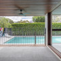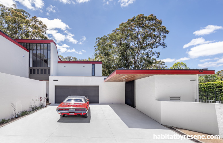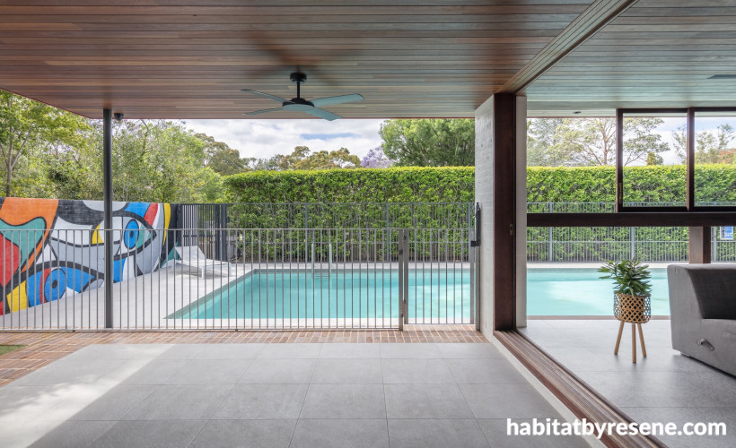 A lot of thought was put into the Resene colour scheme for this much-loved mid-century home. The house, originally built in 1965 by Architect Keith Cottier of Alan Jack and Cottier of the renown ‘Sydney School’, was modernised with an extension designed by architects hungerford+edmunds (www.hungerfordedmunds.com) to connect the original structure with the pool area. The colours were chosen to match photos of the original building. The exterior masonry is painted in Resene Quarter Thorndon Cream paired with accents in Resene Dynamite on the roof edge, Resene Bokara Grey on the balcony columns and Resene Triple Masala on the door and window frames. The mural near the pool is painted in Resene Dynamite, Resene Retro, Resene Half Resolution Blue, Resene Dauntless, Resene Spotlight, Resene Adrenalin and Resene Eighth Masala.