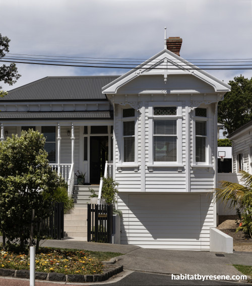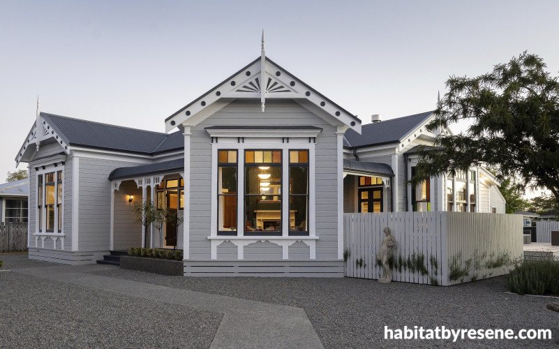 Rob bought the property and restored it to its original glory. Chessa and Rob run Rare Buildings (www.chessastevens.co.nz), a local company that specialises in designing and restoring historic homes. When working on this villa, they chose their exterior paint colour palette carefully, painting the weatherboards in Resene Half Delta, the window trim, doors and details in Resene Grey Friars and the facings, fascias and corner boards in Resene White.