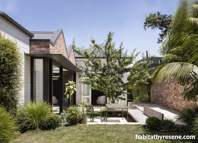 When designing an extension to an Edwardian villa in Auckland, Natasha Markham of Maud (www.maud.nz) wanted her design to complement but not compete with the original building. The twin-peaked extension built around a central courtyard garden uses heritage brick, which Natasha paired with Resene Lumbersider in Resene Double Alabaster for the weatherboards. “The use of the brick outside informed the material palette,” says Natasha. “Resene Double Alabaster provides the perfect foil for these rich natural hues and allows for light play throughout the day.”