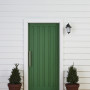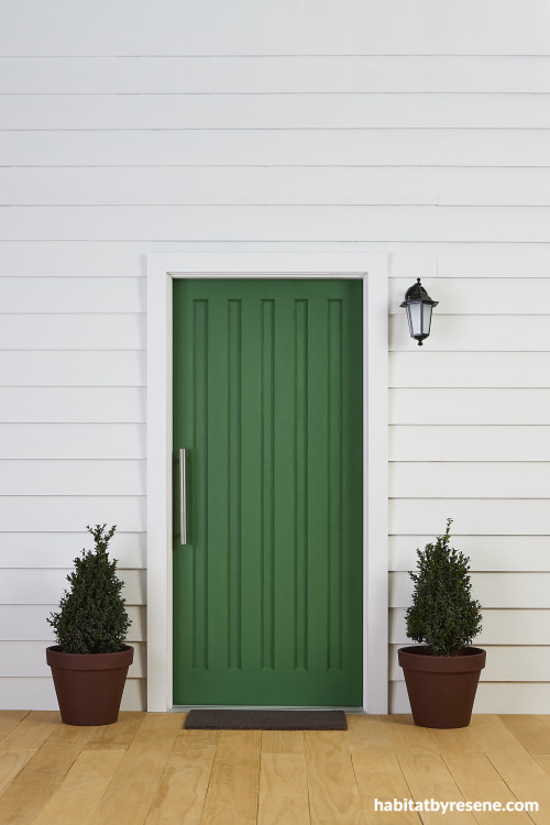A bold front door makes a huge impact. This door is painted in Resene Parsley with trim in Resene Alabaster, weatherboards in Resene Merino and deck in Resene Woodsman Natural. Plant pots in Resene Digeridoo and doormat in Resene Felix. Lantern light from Lightingplus, buxus plants from Mitre 10.