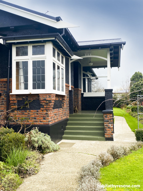 Adam and Sooz had always dreamed of living in a black house, so when they bought their 1927 brick and stucco do-up in Gore, they set about transforming the beige home into a black beauty with Resene All Black. “It had always been the dream to have a black house,” says events manager Adam. “Choosing the right black took a while, as we had to consider the dark fleck through the clinker bricks on part of the house.” Their son Carter chose Resene Double Sea Fog for the trims, and as a family, they decided on Resene Log Cabin as the feature colour for the stairs and front door.
