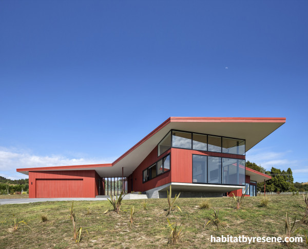 Although its dramatic roof, which points over the landscape to the sea, could only be described as contemporary, Parirau by architect Pete Bossley of Bossley Architects (www.bossleyarchitects.co.nz) also feels like a traditional home thanks to its use of colour. The cedar cladding is stained in Resene Woodsman Totem Pole, a colour reminiscent of traditional rural barns, and the dramatic soffits are in Resene Eighth Pearl Lusta.