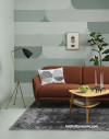 This mid-century modern lounge is brought to life with a creative wall in Resene Robin Egg Blue, Resene Half Robin Egg Blue, Resene Quarter Robin Egg Blue and Resene Smoky Green. The left wall is in Resene Quarter Robin Egg Blue and the floor is painted in Resene Half Robin Egg Blue. DIY artwork in Resene Milk White, Resene Taupe Grey, Resene Fuscous Grey and Resene Half Black White. Sofa, coffee table and floor lamp from Nood, cushions and rug from Freedom, candleholders and tapers from Good Form. Project by Laura Lynn Johnston. Image by Bryce Carleton.