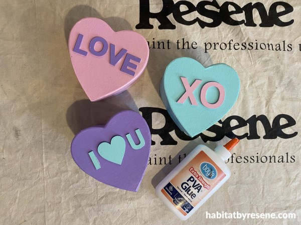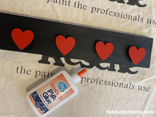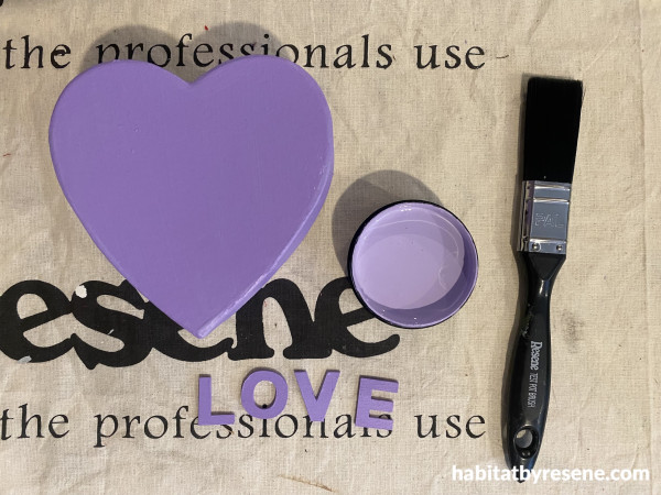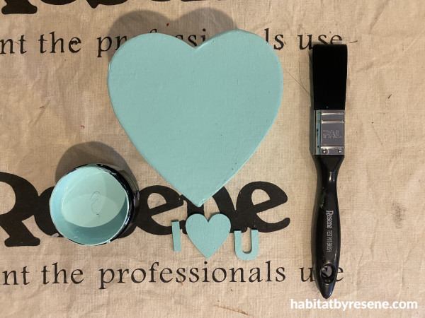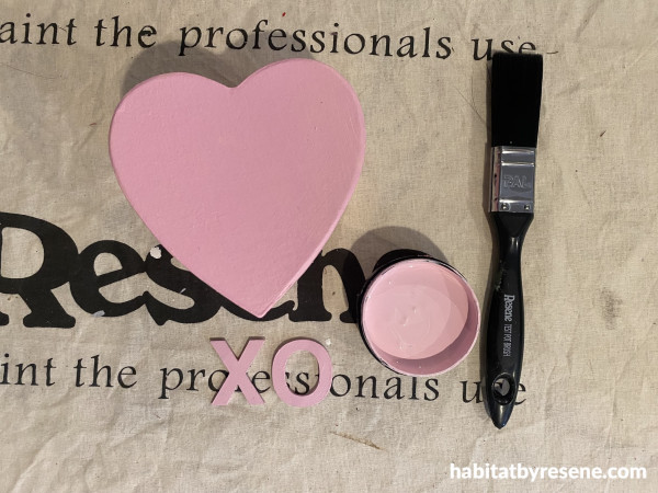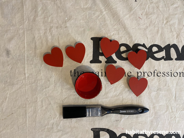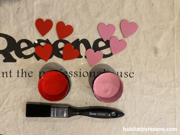 Step 4: Paint the wooden love hearts in Resene Poppy and Hopbush.