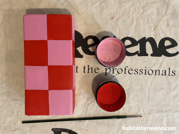 Step 3: Using a fine paintbrush, paint the squares in Resene Poppy.