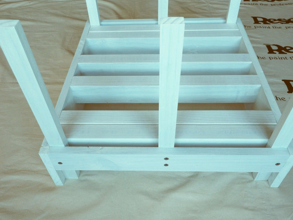 Step 2: Cut two lengths of fence paling to be 450mm long, and then on a table saw rip them down to be 35mm wide, to create six vertical supports. Prime these and screw these into each corner of the box with the one narrower side.