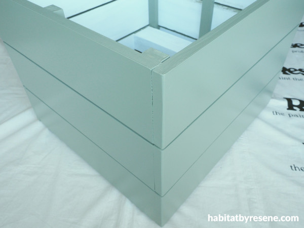 Step 3: Slide the remaining two boxes on top and screw them to the vertical supports, leaving a gap between for rain and air to move in and out. Fill the holes with hole filler, and once dry, sand these smooth and wipe away any dust. Prime with more Resene Quick Dry and then apply two coats of Resene Bitter.