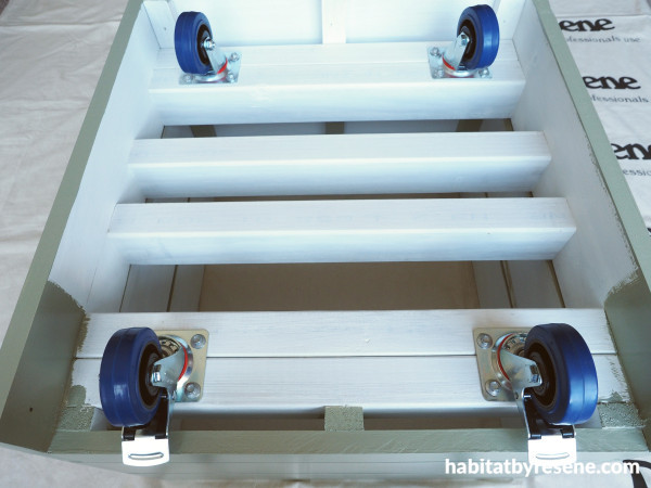 Cut the 70mm x 45mm timber into six lengths at 510mm long. Prime these and use long screws to attach them to the same box as above. Screw them in so that they are flush with the top of the box. The wheels will be screwed to the underside of this timber and will be hidden from view by the sides of the box. The narrower side is so that the wheels with the breaks can be accessed.