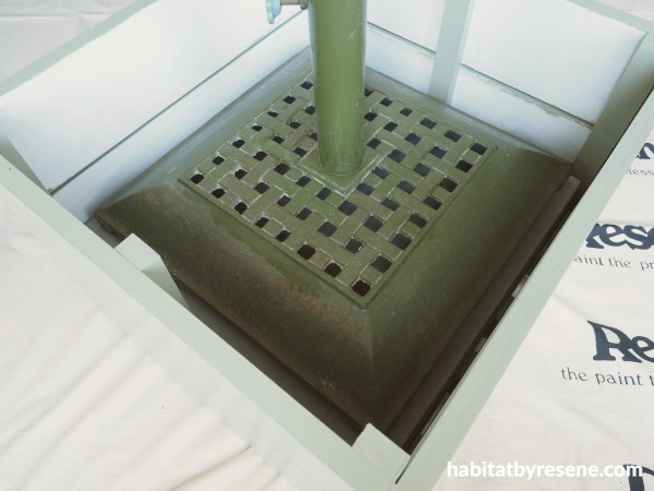 Make the base of your umbrella stand unique, while also doubling as a table for snacks and drinks. Most umbrella stands are just a boring concrete base, but this one is both stylish and practical. We painted ours in the serene green of Resene Bitter.