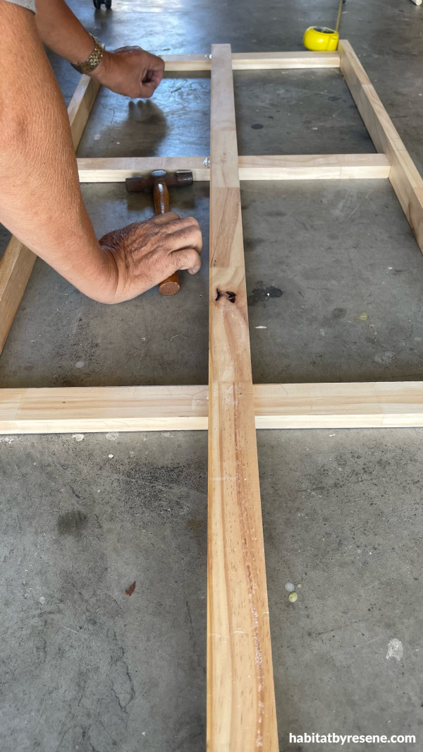 Add some PVA glue at these points and using panel pins, nail the top three cross bars into the uprights. Have the 40mm face of the crossbar pieces facing the front of the frame.