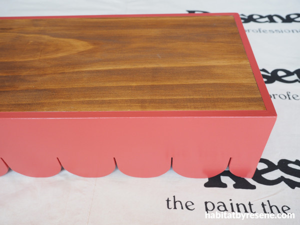 Step 1: Start by cutting the main board to width and length (mine is 22cm wide and 117cm long). Sand any rough edges smooth, and then stain the board with two coats of Resene Colorwood Walnut.