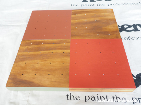 Step 4: Use painters type to tape off sections of the wood. Divide the top surface into four equal squares, and paint one square with two coats of Resene Mocha and the opposite square in Resene Raging Bull (remember to prime first with one coat of Resene Quick Dry).
