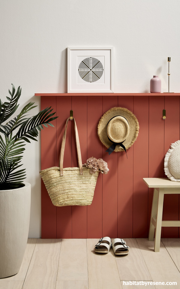 This panelled wall doubling as a storage space in Resene Apple Blossom pairs well with walls in Quarter White Pointer. The floor is stained in Colorwood Breathe Easy, bench in Beachcomber, pot in Half Perfect Taupe and vase in Contented. Artwork by Anna Leyland, hat, shoes and bag from Città. Project by Annick Larkin, image by Bryce Carleton.