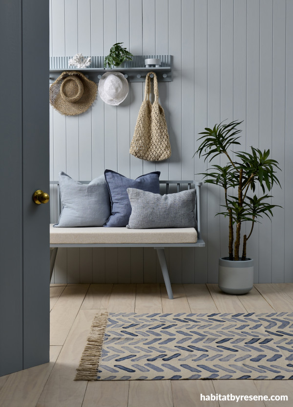 Gentle blues create a beachy backdrop for this entrance. Walls are painted in Resene Quarter Powder Blue from the Karen Walker Paints collection, floor in Colorwood Breathe Easy, chair in Powder Blue, shelf in Clouded Blue, planter in Periglacial Blue and Powder Blue. Project by Vanessa Nouwens, image by Bryce Carleton.