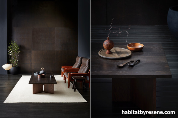 Despite the inky depth of Resene Colour Enhance Japan Black, the grain of your timber remains visible so that you don’t lose the appeal of its natural beauty and texture. In this space (left), the plywood panels (back wall) and coffee table are finished in two coats of Resene Aquaclear satin mixed with Resene Colour Enhance Japan Black, floor in three coats of Resene Qristal ClearFloor 1K mixed with Resene Colour Enhance Japan Black, side walls, column and tray painted in Resene Black Sand, stool and large wooden bowl in Resene Colour Enhance Walnut mixed with Resene Aquaclear satin. On the table (right) the large tray is in one coat of Resene Colour Enhance Japan Black, spoons in two coats of Resene Colour Enhance Japan Black and bowl in Resene Colour Enhance Red Brown all in Resene Aquaclear satin. Kettle, mugs, vase and lamp from Public Record, armchairs from Mr. Bigglesworthy.