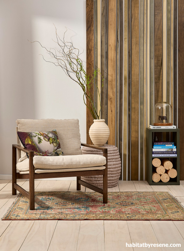 Wood strips in Resene Woodsman Natural Wood Oil, tinted to Resene Tararua, Resene Kahurangi, Resene Paparoa, Resene Fiordland, Resene Mt Richmond and Resene Aotea make up a unique feature wall. Floor stain washed in Resene Colorwood Breathe Easy. Wall painted in Resene SpaceCote Low Sheen in Resene Westar with trim in Resene Eighth Rice Cake, rattan side table in Resene Otter, shelf unit in Resene El Paso, large vase in Resene Sour Dough and small vase in Resene Cape Cod. Chair from Dawson & Co. Project by Katrina Hobbs, image by Bryce Carleton.