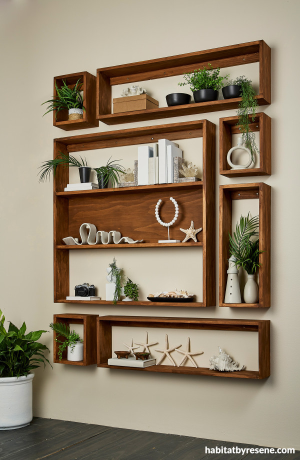 Map your design out, then pencil the shapes on your wall as a guide. Paint or stain your boxes before hanging. Try the Resene Colorwood Whitewash for a relaxed, home-made finish, or paint in Resene Waterborne Super Gloss tinted to Resene Black for a sleek, modern look.